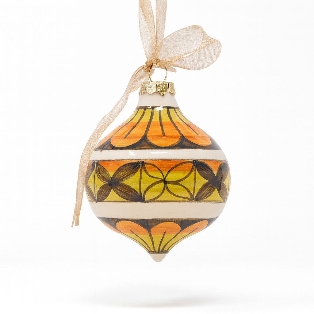 This ornament exemplifies handmade Italian design: thoughtful geometry, bold yet harmonious colors, and a blend of tradition with artistic flair. It would be at home in curated holiday décor or as a year-round accent on a ceramic display tree.