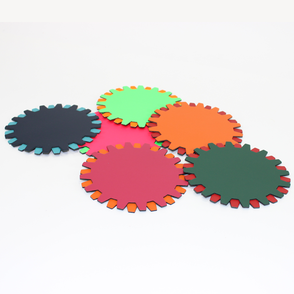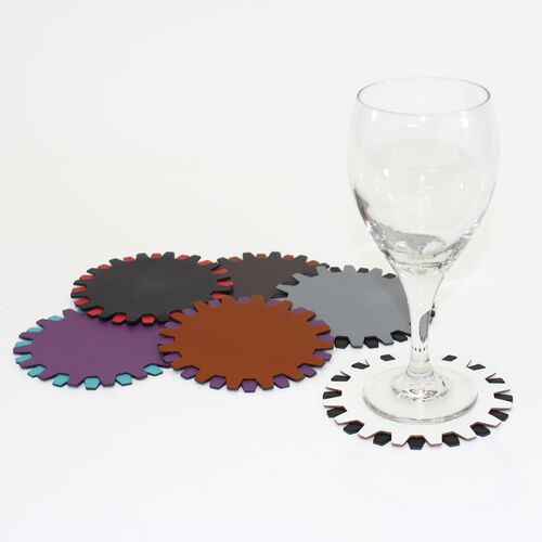 Bonded leather coasters layered in two different color patterns. 100's of variations available.